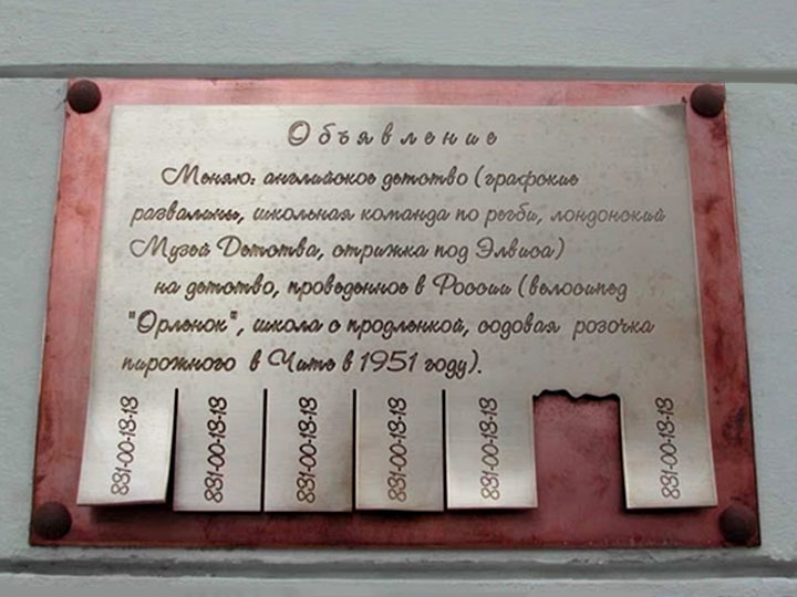 Текст объявления патриотичен: «Меняю английское детство (графские развалины, школьная команда по регби, лондонский Музей детства, стрижка под Элвиса) на детство, проведенное в России (велосипед „Орленок“, школа с продленкой, содовая, розочка пирожного в Чите в 1951 году».